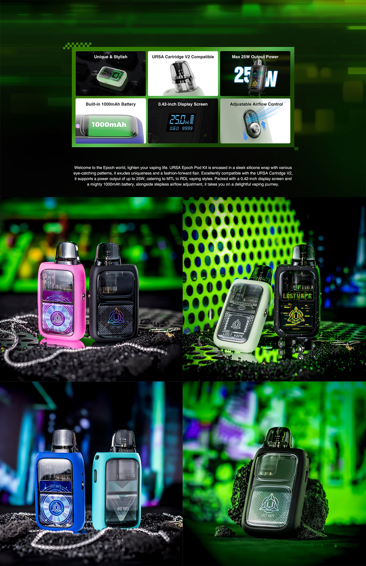 Lost Vape Ursa Epoch، یکی از تازهترین محصولات از Lost Vape، با طراحی جذابی که شامل یک پوشش سیلیکونی منحصر به فرد است که به راحتی در تاریکی قابل دیدن است و حس نرمی و لطافت را به شما میدهد. یک صفحه نمایش ۰.۴۲ اینچی در قسمت بالای این پاد طراحی شده که کارکردن با آن را برای شما راحت تر میکند.URSA Epoch با حداکثر قدرت ۲۵ وات میتواند دود بسیاری تولید کند. با استفاده از چیپست Quest 2.0، این دستگاه عملکرد بسیار قوی را ارائه میدهد.پاد اورسا اِپوک کمپانی لاست ویپ با ظاهری کوچک و جمع و جور یک باتری ۱۰۰۰ میلی امپری را در خود جای داده است که با شارژر تایپ سی (۵ ولت ۱ آمپر) شارژ میگردد. علاوه بر این، Epoch دارای یک چراغ LED در جلوی بدنهی دستگاه است که برای نمایش وضعیت باتری تعبیه شده است.